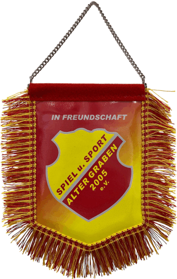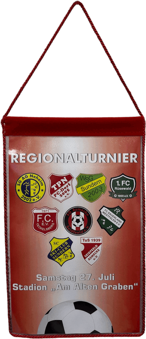 Sie erhalten alle Wimpel immer beidseitig bedruckt. (Vorder- und Rückseite kann auch ohne Mehrkosten unterschiedlich sein) Unsere Wimpel sind in einer wasserabweisenden Folie eingenäht. Das Abschlussband oben quer ist aus Velour oder Flausch. Bei der Aufhängung können sie zwischen einer Kordel oder einer Kette wählen, bei der Umnähung der Wimpel zwischen einer Kordel oder einer Franse. Die hier abgebildeten Wimpel sind nur Beispiele, wie ein Wimpel gestaltet werden kann. Gerne erstellen wir Ihnen einen individuellen und kostenlosen Korrekturabzug nach Ihren Wünschen und Vorstellungen, ggf. mit Ihrem Vereinslogo und/oder Text. ( hier eine Übersicht von Gestaltungsmöglichkeiten) Es gibt eine Mindestabnahmemenge von 5 Stück. Bei einer Bestellung von 5-19 Stück gibt es eine einmalige Erstellungspauschale von 15,00 Euro pro Auftrag. Bein Nachbestellungen entfällt diese Pauschale.